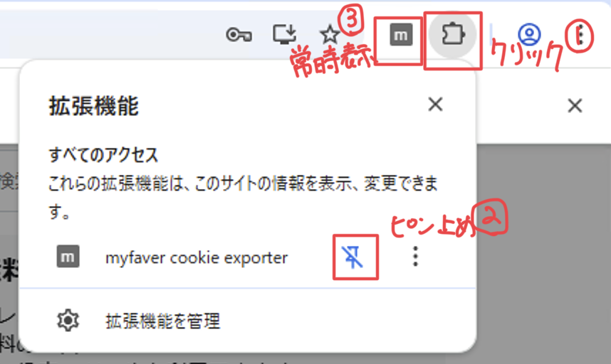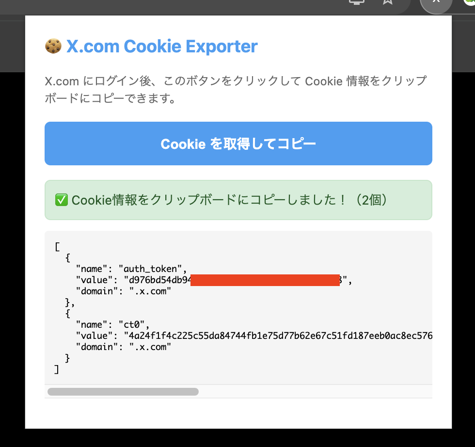 X(Twitter) へログインが完了した後、拡張機能をクリック(③)し Cookie を取得します。